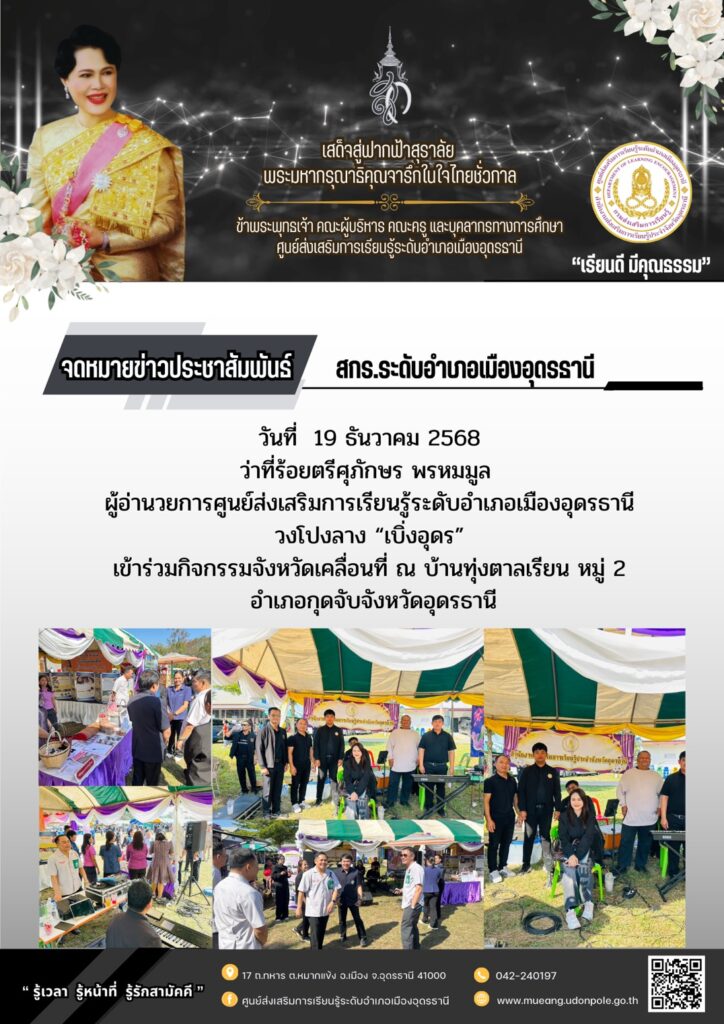 วันศุกร์ที่ 19 ธันวาคม 2568  วงโปงลาง “เบิ่งอุดร” เข้าร่วมกิจกรรมจังหวัดเคลื่อนที่ ณ บ้านทุ่งตาลเลียน อำเภอกุดจับ จังหวัดอุดรธานี