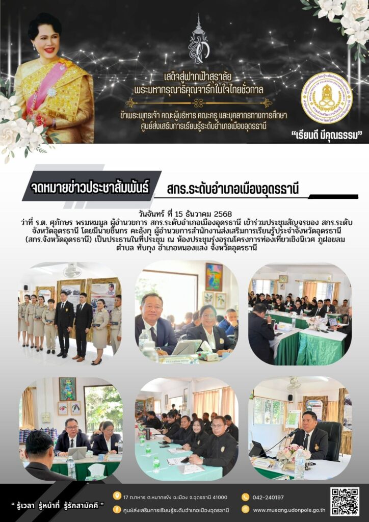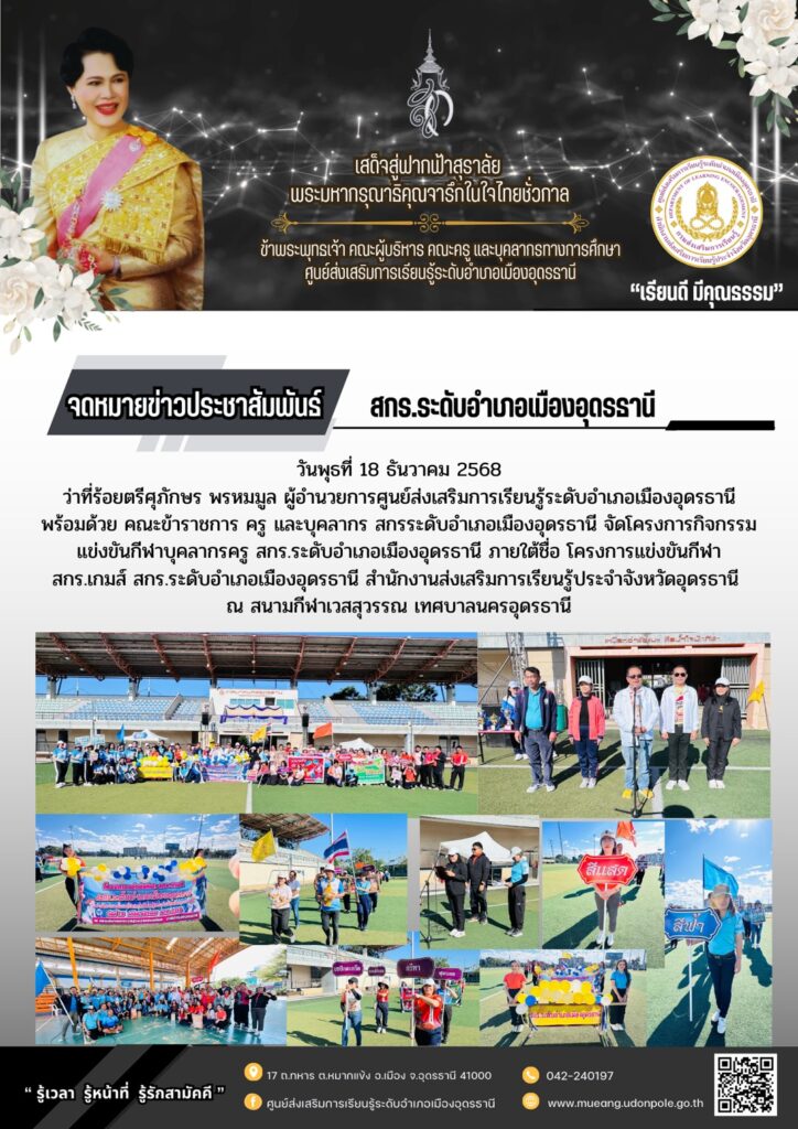 วันพฤหัสบดีที่ 18 ธันวาคม 2568  จัดกิจกรรมแข่งขันกีฬาบุคลากรครู ของ สกร.ระดับอำเภอเมืองอุดรธานี ณ สนามกีฬาเวสสุวรรณ เทศบาลนครอุดรธานี