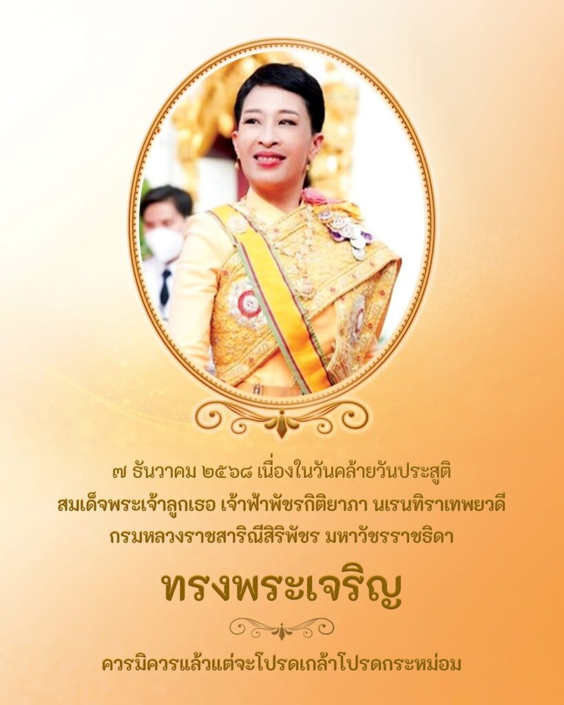 7 ธันวาคม 2568 เนื่องในวันคล้ายวันประสูติ สมเด็จพระเจ้าลูกเธอ เจ้าฟ้าพัชรกิติยาภา นเรนทิราเทพยวดี กรมหลวงราชสาริณีสิริพัชร มหาวัชรราชธิดา