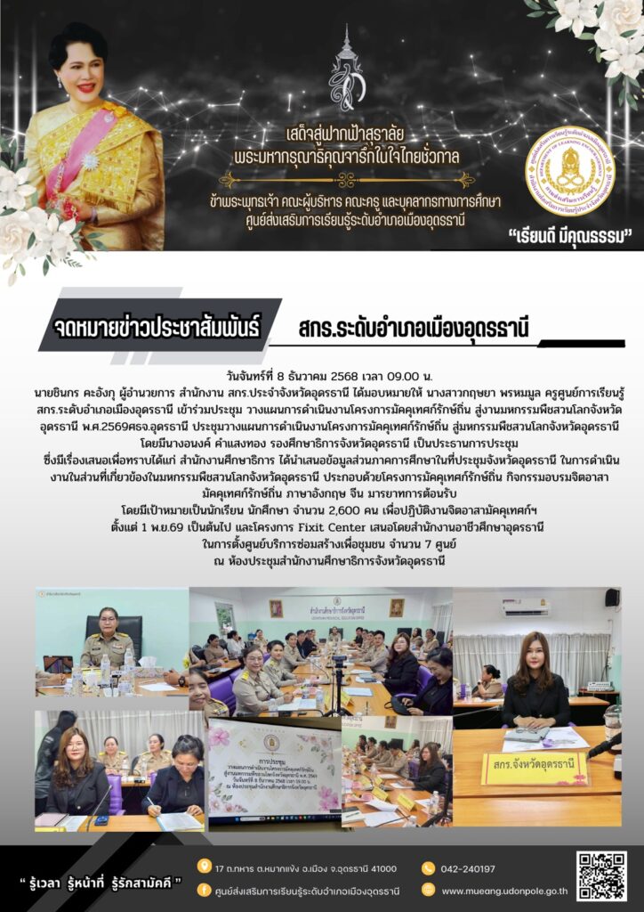 วันพฤหัสบดีที่ 11 ธันวาคม 2568  ประชุมโครงการมัคคุเทศก์รักถิ่น สู่งานมหกรรมพืชสวนโลกจังหวัดอุดรธานี พ.ศ.2569 ณ ห้องประชุมชั้น1 สกร.ระดับอำเภอเมืองอุดรธานี