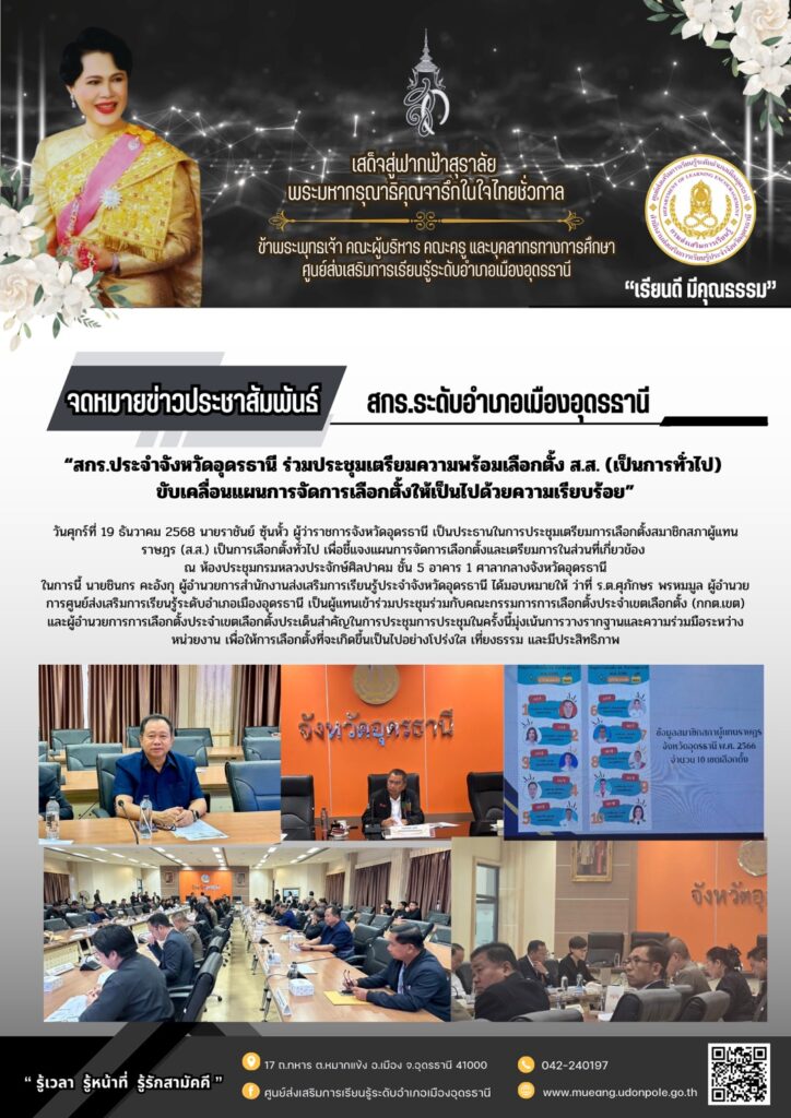 วันศุกร์ที่ 19 ธันวาคม 2568  เข้าร่วมประชุมกับคณะกรรมการการเลือกตั้ง (กกต.เขต) จังหวัดอุดรธานี ณ ห้องประชุมกรมหลวงประจักษ์ศิลปาคม ศาลากลางจังหวัดอุดรธานี