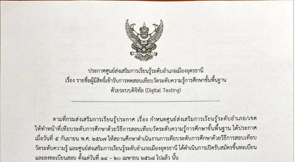 ข่าว, ประชาสัมพันธ์“ประกาศ”ศูนย์ส่งเสริมการเรียนรู้ระดับอำเภอเมืองอุดรธานีเรื่อง รายชื่อผู้มีสิทธิ์เข้ารับการทดสอบเทียบวัดระดับความรู้การศึกษาขั้นพื้นฐานด้วยระบบดิจิทัล 27 พฤษภาคม 2025 “ประกาศ”ศูนย์ส่งเสริมการเรียนรู้ระดับอำเภอเมืองอุดรธานีเรื่อง รายชื่อผู้มีสิทธิ์เข้ารับการทดสอบเทียบวัดระดับความรู้การศึกษาขั้นพื้นฐานด้วยระบบดิจิทัล Read Post »