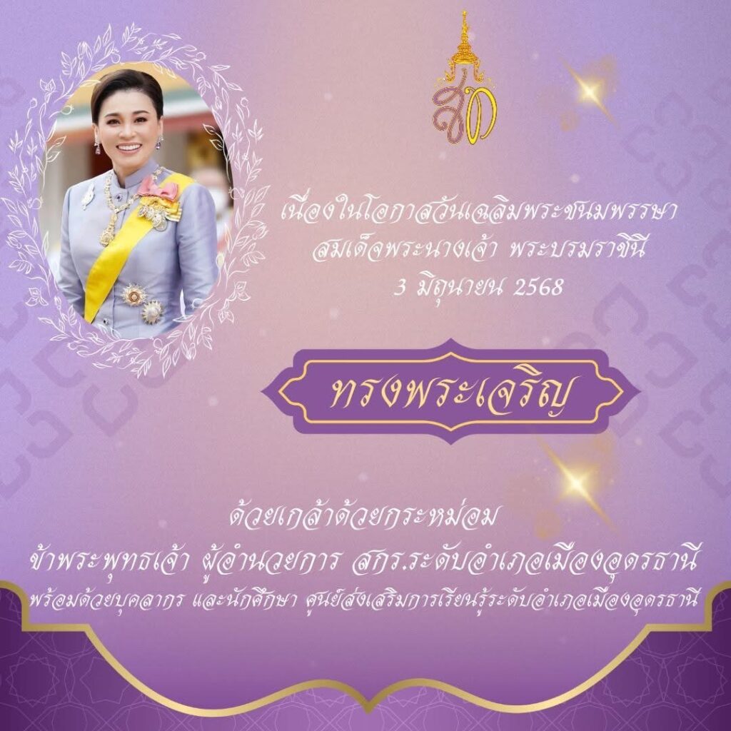 วันที่ 3 มิถุนายน 2568 ด้วยเกล้าด้วยกระหม่อม ข้าพระพุทธเจ้า ผู้อำนวยการ สกร.ระดับอำเภอเมืองอุดรธานีพร้อมด้วยบุคลากร และนักศึกษา ศูนย์ส่งเสริมการเรียนรู้ระดับอำเภอเมืองอุดรธานีเนื่องในโอกาสวันเฉลิมพระชนมพรรษาสมเด็จพระนางเจ้า พระบรมราชินี