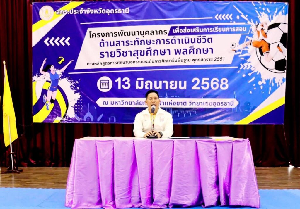 พร้อมด้วยผู้บริหารสถานศึกษา ครู และบุคลากรทางการศึกษา เข้าร่วมโครงการพัฒนาบุคลากร เพื่อส่งเสริมการเรียนการสอนด้านสาระทักษะการดำเนินชีวิตรายวิชาสุขศึกษา พลศึกษา ตามหลักสูตรการศึกษานอกระบบระดับการศึกษาขั้นพื้นฐาน พุธศักราช 2551 โดยได้รับเกียรติจาก นายชินกร คะอังกุ ผู้อำนวยการสำนักงานส่งเสริมการเรียนรู้ประจำจังหวัดอุดรธานีเป็นประธานในพิธีเปิด ณ มหาวิทยาลัยการกีฬาแห่งชาติ วิทยาเขตอุดรธานี