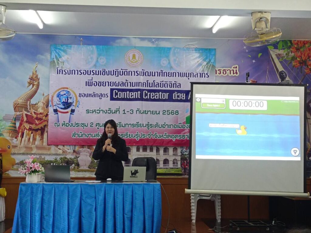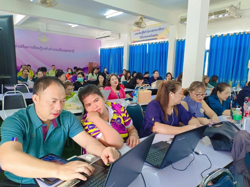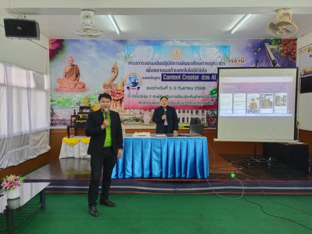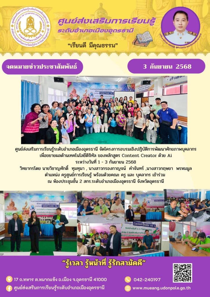 ศูนย์ส่งเสริมการเรียนรู้ระดับอำเภอเมืองอุดรธานี จัดโครงการอบรมเชิงปฎิบัติการพัฒนาศักยภาพบุคลากรเพื่อขยายผลด้านเทคโนโลยีดิจิทัล ของหลักสูตร Content Creator ด้วย Aiระหว่างวันที่ 1 – 3 กันยายน 2568 วิทยากรโดย นายวิชาญศักดิ์ ทุมทุมา , นางสาวกรองกาญจน์ คำจันทร์ ,นางสาวกฤษยา พรหมมูล