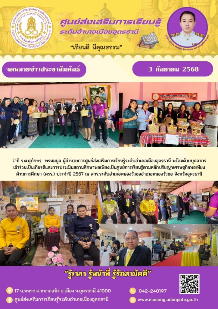 วันที่ 3 กันยายน 2568 ว่าที่ ร.ต.ศุภักษร พรหมมูล ผู้อำนวยการศูนย์ส่งเสริมการเรียนรู้ระดับอำเภอเมืองอุดรธานี พร้อมด้วยบุคลากรเข้าร่วมเป็นเกียรติและการประเมินสถานศึกษาพอเพียงเป็นศูนย์การเรียนรู้ตามหลักปรัชญาเศรษฐกิจพอเพียง ด้านการศึกษา (ศรร.) ประจำปี 2567 ณ สกร.ระดับอำเภอหนองวัวซออำเภอหนองวัวซอ จังหวัดอุดรธานี