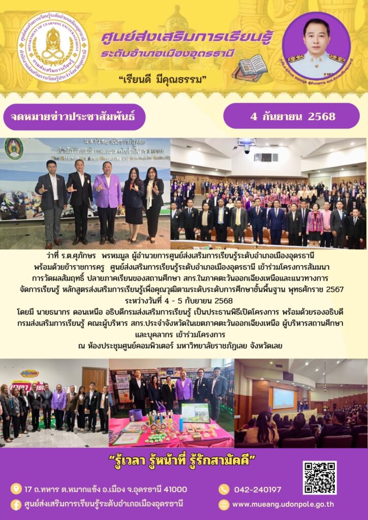 ว่าที่ ร.ต.ศุภักษร พรหมมูล ผู้อำนวยการศูนย์ส่งเสริมการเรียนรู้ระดับอำเภอเมืองอุดรธานี พร้อมด้วยข้าราชการครู ศูนย์ส่งเสริมการเรียนรู้ระดับอำเภอเมืองอุดรธานี เข้าร่วมโครงการสัมมนาการวัดผลสัมฤทธิ์ ปลายภาคเรียนของสถานศึกษา สกร.ในภาคตะวันออกเฉียงเหนือและแนวทางการ จัดการเรียนรู้ หลักสูตรส่งเสริมการเรียนรู้เพื่อคุณวุฒิตามระดับระดับการศึกษาชั้นพื้นฐาน พุทธศักราช 2567ระหว่างวันที่ 4 – 5 กับยายน 2568โดยมี นายธนากร ดอนเหนือ อธิบดีกรมส่งเสริมการเรียนรู้ เป็นประธานพิธีเปิดโครงการ พร้อมด้วยรองอธิบดีกรมส่งเสริมการเรียนรู้ คณะผู้บริหาร สกร.ประจำจังหวัดในเขตภาคตะวันออกเฉียงเหนือ ผู้บริหารสถานศึกษา และบุคลากร เข้าร่วมโครงการ ณ ห้องประชุมศูนย์คอมพิวเตอร์ มหาวิทยาลัยราชภัฏเลย จังหวัดเลย