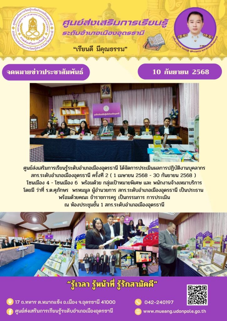 ศูนย์ส่งเสริมการเรียนรู้ระดับอำเภอเมืองอุดรธานี ได้จัดการประเมินผลการปฏิบัติงานบุคลากร สกร.ระดับอำเภอเมืองอุดรธานี ครั้งที 2 ( 1 เมษายน 2568 – 30 กันยายน 2568 )โซนเมือง 4 – โซนเมือง 6 พร้อมด้วย กลุ่มเป้าหมายพิเศษ และ พนักงานจ้างเหมาบริการโดยมี ว่าที่ ร.ต.ศุภักษร พรหมมูล ผู้อำนวยการ สกร.ระดับอำเภอเมืองอุดรธานี เป็นประธานพร้อมด้วยคณะ ข้าราชการครู เป็นกรรมการ การประเมินณ ห้องประชุมชั้น 1 สกร.ระดับอำเภอเมืองอุดรธานี