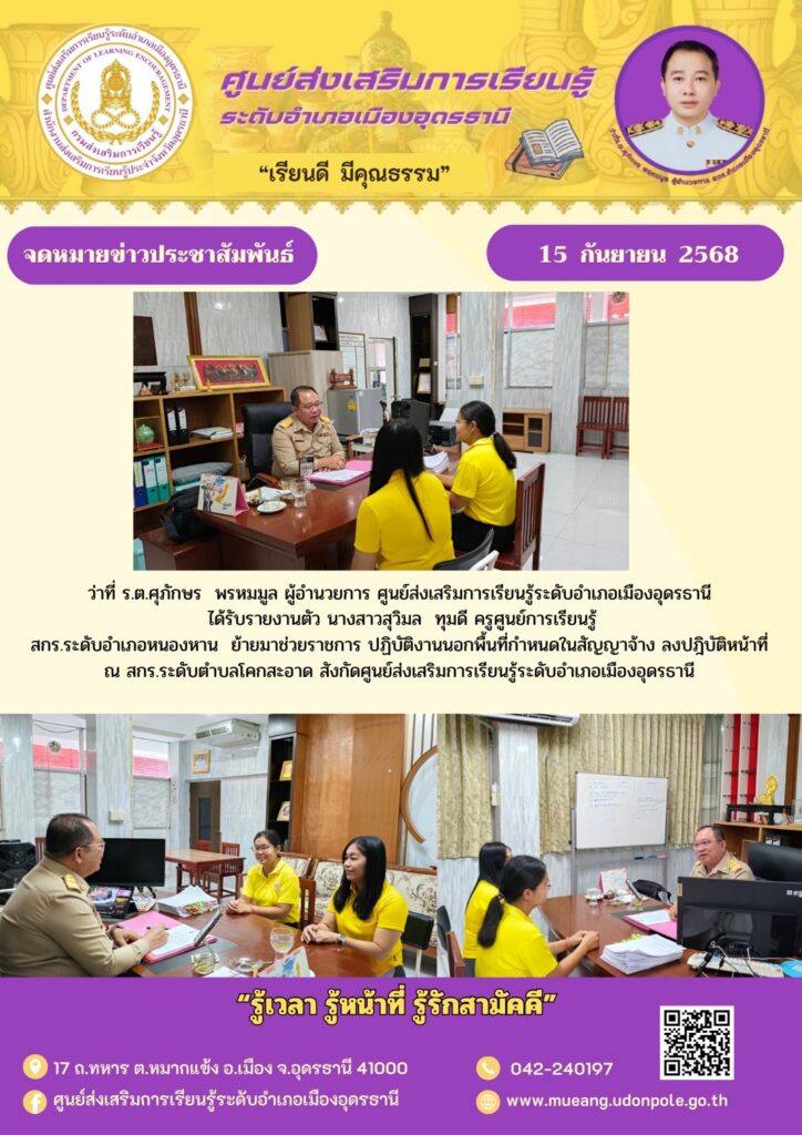 ว่าที่ ร.ต.ศุภักษร พรหมมูล ผู้อำนวยการ ศูนย์ส่งเสริมการเรียนรู้ระดับอำเภอเมืองอุดรธานี ได้รับรายงานตัว นางสาวสุวิมล ทุมดี ครูศูนย์การเรียนรู้
