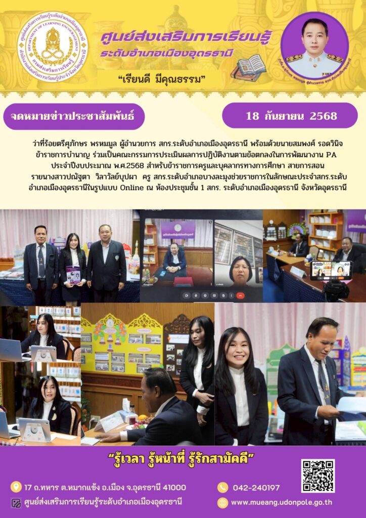 วันที่ 18 กันยายน 2568 ว่าที่ร้อยตรีศุภักษร พรหมมูล ผู้อำนวยการ สกร.ระดับอำเภอเมืองอุดรธานี พร้อมด้วยนายสมพงศ์ รอดวินิจ ข้าราชการบำนาญ ร่วมเป็นคณะกรรมการประเมินผลการปฏิบัติงานตามข้อตกลงในการพัฒนางาน PA ประจําปีงบประมาณ พ.ศ.2568 สำหรับข้าราชการครูและบุคลากรทางการศึกษา สายการสอน รายนางสาวปณัฐตา วิลาวัลย์บุปผา ครู สกร.ระดับอำเภอบางละมุงช่วยราชการในลักษณะประจำสกร.ระดับอําเภอเมืองอุดรธานีในรูปแบบ Online ณ ห้องประชุมชั้น 1 สกร. ระดับอำเภอเมืองอุดรธานี จังหวัดอุดรธานี