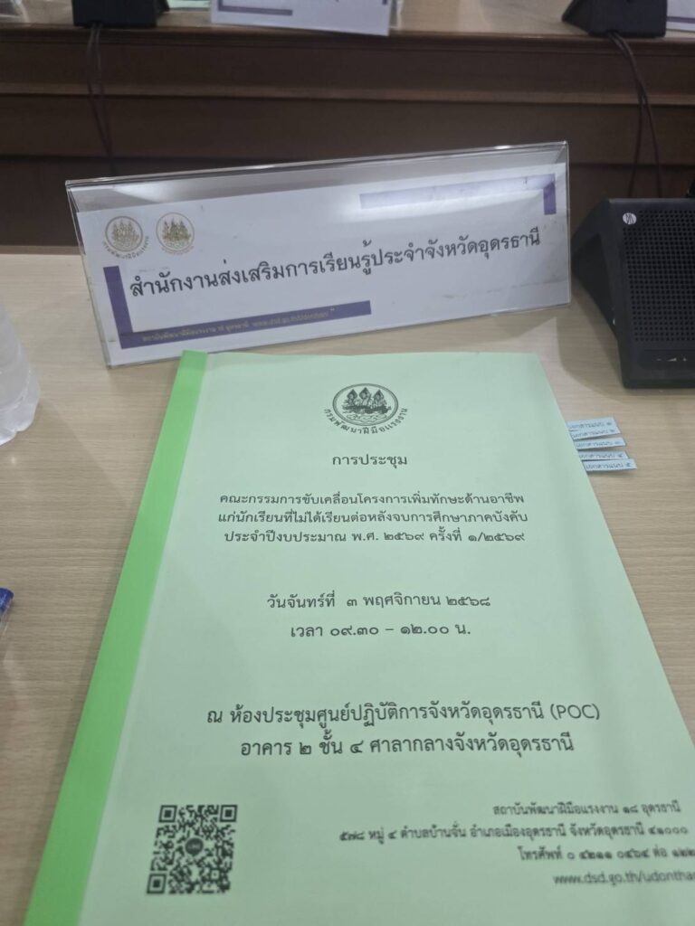 วันจันทร์ที่ 3 พฤศจิกายน 2568 ประชุมคณะกรรมการขับเคลื่อนโครงการ เพิ่มทักษะด้านอาชีพ แก่นักเรียนที่ไม่ได้เรียนต่อหลังจบการศึกษาภาคบังคับ ณ ห้องประชุมศูนย์ปฎิบัติการจังหวัดอุดรธานี (POC) อาคาร 2 ชั้น 4ศาลากลางจังหวัดอุดรธานี
