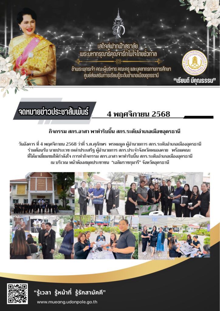วันอังคาร ที่ 4 พฤศจิกายน 2568 ว่าที่ ร.ต.ศุภักษร พรหมมูล ผู้อำนวยการ สกร.ระดับอำเภอเมืองอุดรธานี ร่วมต้อนรับ นายประเวช เหล่าประเสริฐ ผู้อำนวยการ สกร.ประจำจังหวัดหนองคาย พร้อมคณะที่ได้มาเยี่ยมชมให้กำลังใจ การทำกิจกรรม สกร.อาสา พาทำริบบิ้น สกร.ระดับอำเภอเมืองอุดรธานี ณ บริเวณ หน้าห้องสมุดประชาชน “เฉลิมราชกุมารี” จังหวัดอุดรธานี