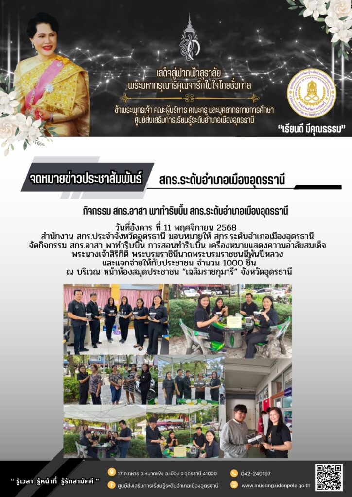 วันที่ 11 พฤศจิกายน 2568 สำนักงาน สกร.ประจำจังหวัดอุดรธานี มอบหมายให้ สกร.ระดับอำเภอเมืองอุดรธานี จัดกิจกรรม สกร.อาสา พาทำริ้บบิ้น เพื่อน้อมถวายความอาลัย ด้วยสำนึกในพระมหากรุณาธิคุณอย่างหาที่สุดมิได้สมเด็จพระนางเจ้าสิริกิติ์ พระบรมราชินีนาถพระบรมราชชน์นีพันปีหลวง ดังนี้