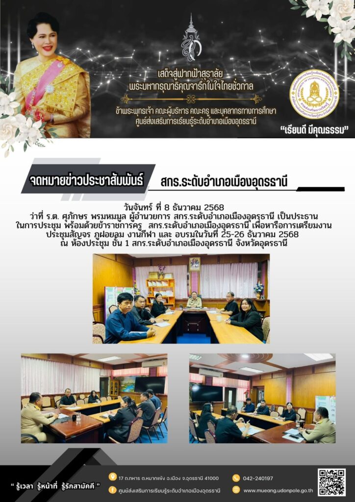 วันพฤหัสบดีที่ 11 ธันวาคม 2568 ประชุมโครงการมัคคุเทศก์รักถิ่น สู่งานมหกรรมพืชสวนโลกจังหวัดอุดรธานี พ.ศ.2569 ณ ห้องประชุมชั้น1 สกร.ระดับอำเภอเมืองอุดรธานี