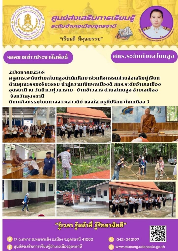 ข่าว, ประชาสัมพันธ์สกร.ระดับอำเภอเมืองอุดรธานีจัดโครงการ กิจกรรมค่ายส่งเสริมผู้เรียนด้าน คุณธรรมจริยธรรม นำสู่ความเป็นพลเมืองดี ศกร.ระดับตำบลทั้งหมด 21 แห่ง 21 สิงหาคม 2025 สกร.ระดับอำเภอเมืองอุดรธานีจัดโครงการ กิจกรรมค่ายส่งเสริมผู้เรียนด้าน คุณธรรมจริยธรรม นำสู่ความเป็นพลเมืองดี ศกร.ระดับตำบลทั้งหมด 21 แห่ง Read Post »