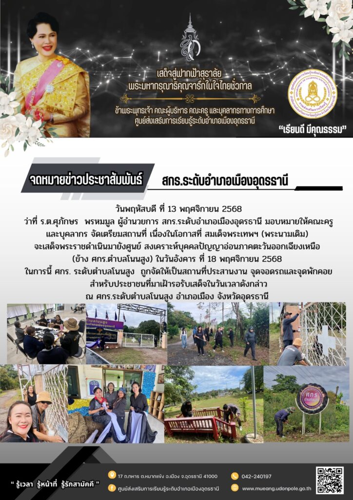 วันพฤหัสบดี ที่ 13 พฤศจิกายน 2568 จัดเตรียมสถานที่ เนื่องในโอกาสที่ สมเด็จพระเทพฯ (พระนามเดิม)จะเสด็จพระราชดำเนินมายังศูนย์สงเคราะห์บุคคลปัญญาอ่อนภาคตะวันออกเฉียงเหนือ(ข้าง ศกร.ตำบลโนนสูง) ในวันอังคาร ที่ 18 พฤศจิกายน 2568